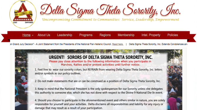 AKAs received an email that said sisters could wear sorority colors at protests, but asked them to “refrain” from wearing any sorority “paraphernalia.” Deltas were notified of a similar prohibition on their organization’s website.